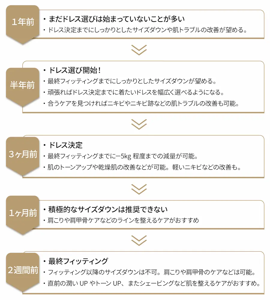 ドレスに合わせて自分がこうなりたい!こう見られたい!という理想のボディがある場合はそのためのケアを最優先で始めるのがおすすめです。