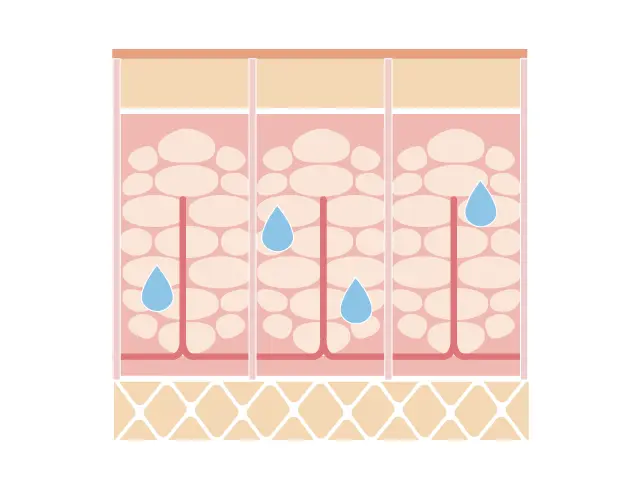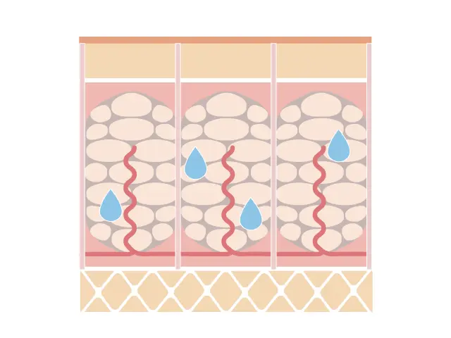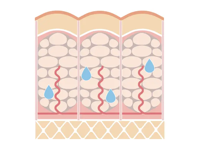 通常の脂肪は毛細血管のすぐそばにあるため、血液によって運ばれた必要な栄養素を取り込んで脂肪燃焼させたり、不要な物質を毛細血管に送り届けることで全身のエネルギーとして消費したり、さらには汗や尿として排泄できるようにしたりしています。しかしセルライトにより毛細血管から離れてしまった脂肪細胞は栄養素や老廃物のやり取りができないため、脂肪燃焼もしにくいまま、ずっとその場所に留まってしまうのです。