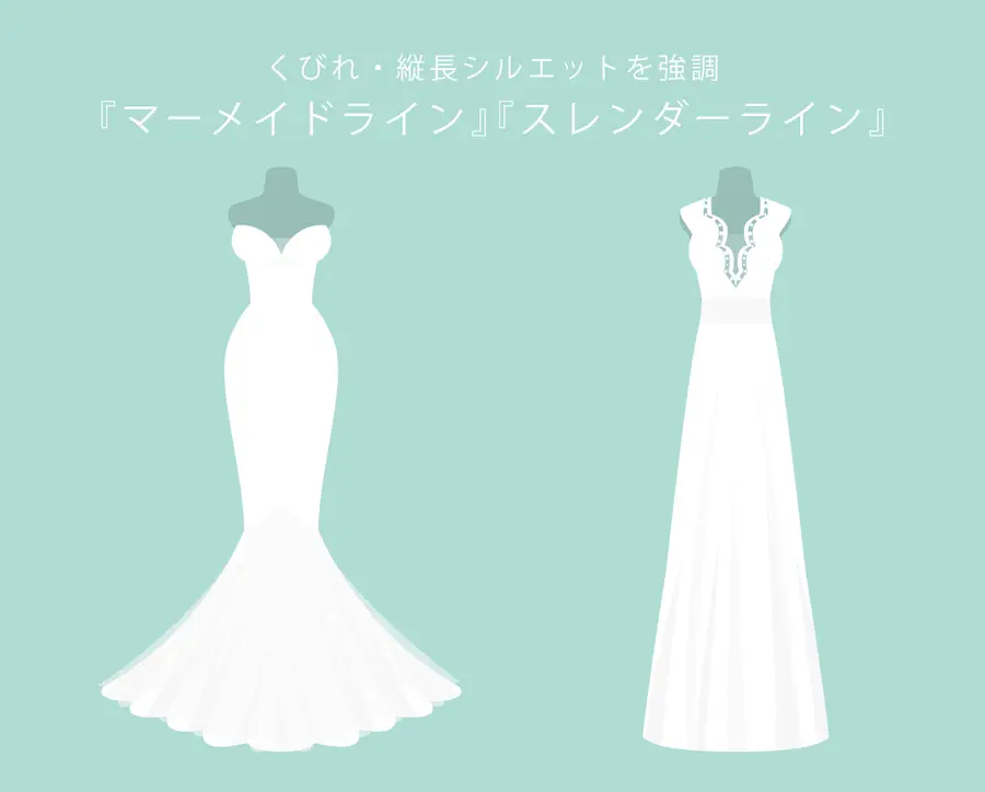 マーメイドラインは上半身から膝のあたりまでは体にフィットし、膝下の裾の広がり方が人魚の尾ひれのように見えるウエディングドレスで、スレンダーラインはスカートのボリュームがなく全体的に細身のシルエットになる落ち着いた雰囲気のあるウエディングドレスです。どちらもウエストからヒップにかけての曲線が女性らしく、しなやかでエレガントな印象を与えることでも近年は特に人気のあるデザインです。