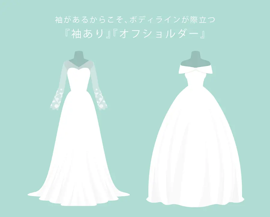 クラシカルな印象もあるレースなどの袖や可愛らしいオフショルダーのタイプは、ほっそりとした二の腕や鎖骨のラインが女性らしく美しい人気のデザインです。