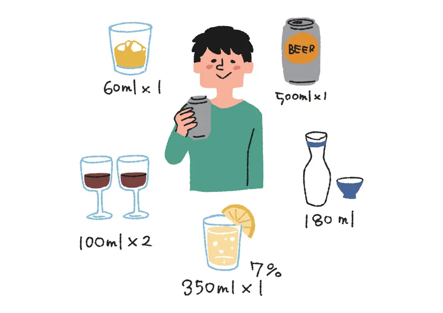 厚生労働省が定める「健康日本21」では、“節度ある適切な飲酒量”は純アルコール量で20g/日程度とされています。また、「健康日本21(第二次)」の“生活習慣病のリスクを高める飲酒量”は男性は40g/日以上、女性は20g/日以上とされています。