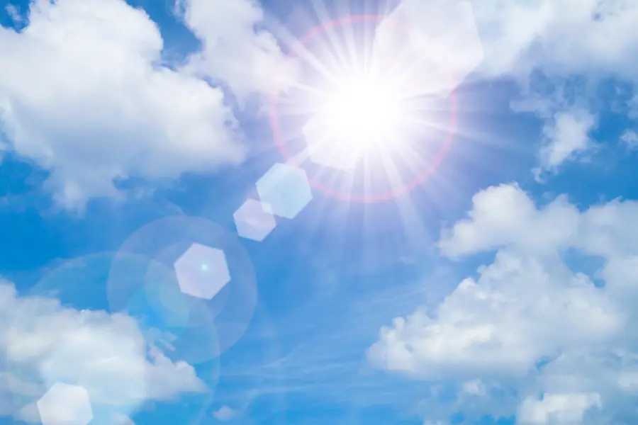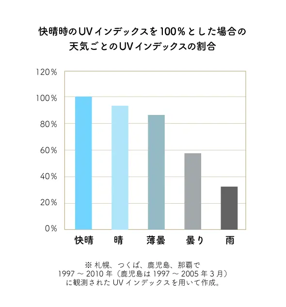 快晴時が最も紫外線量が多く、晴れでもほとんど変わらず地表に届きます。そして空全体が薄く雲で覆われているような状態の日(建物の影ができる程度)も、快晴時の80~90%ほどにしか減少しません。