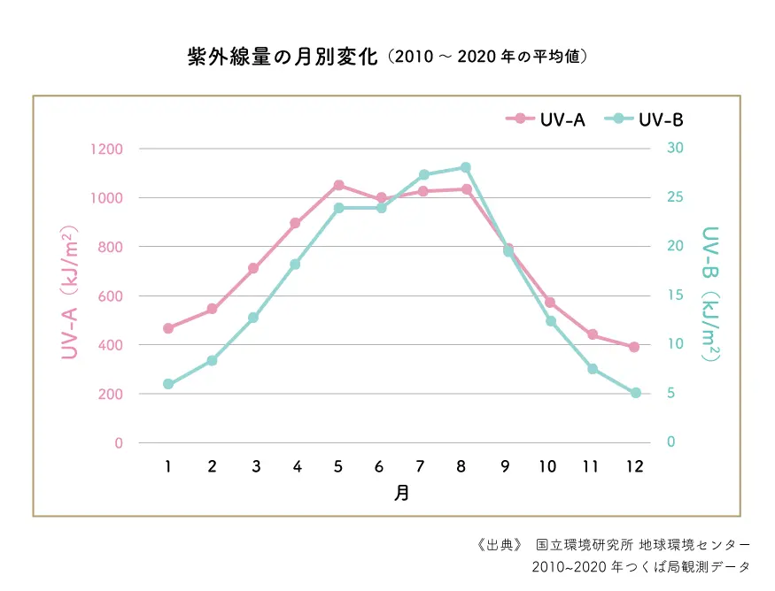 また、UV-Bの量は7~8月にピークを迎え冬場は1/5程度にまで減少するのに対し、UV-Aは4~9月まで紫外線量が多い時期が続き、冬場でもピーク時の半分程度にしか減少しないというのも特徴です。