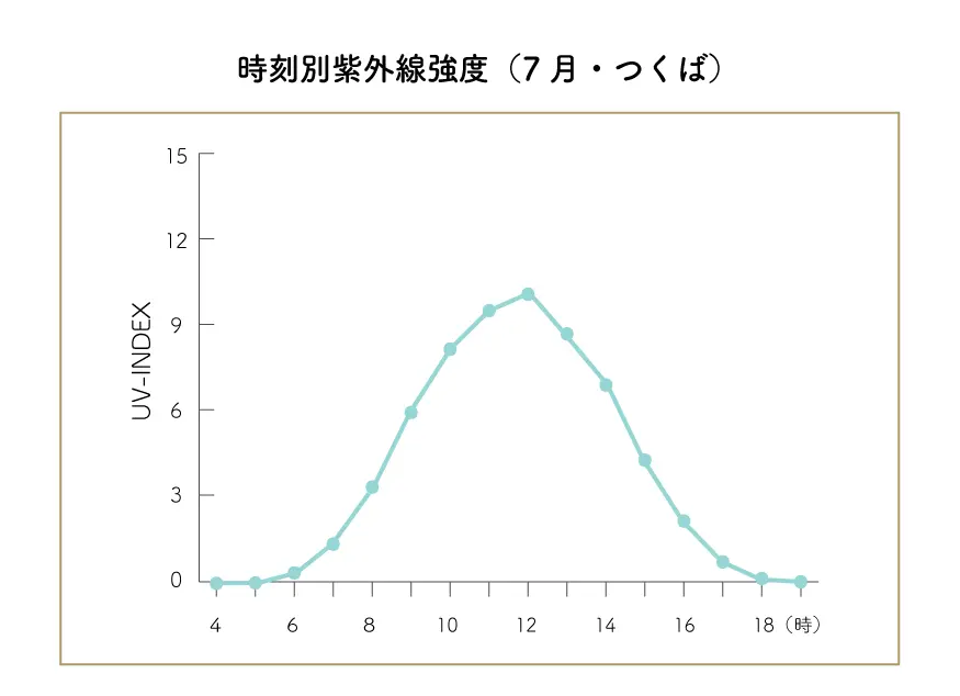 紫外線は若干の地域差もありますが、12時前後の太陽が最も高くなる時に一番多くなります。同じ快晴の日では午前8時~9時頃や午後3時頃ではピーク時の半分程度の量で、日の出前や日没後には紫外線量がほぼ0になります。