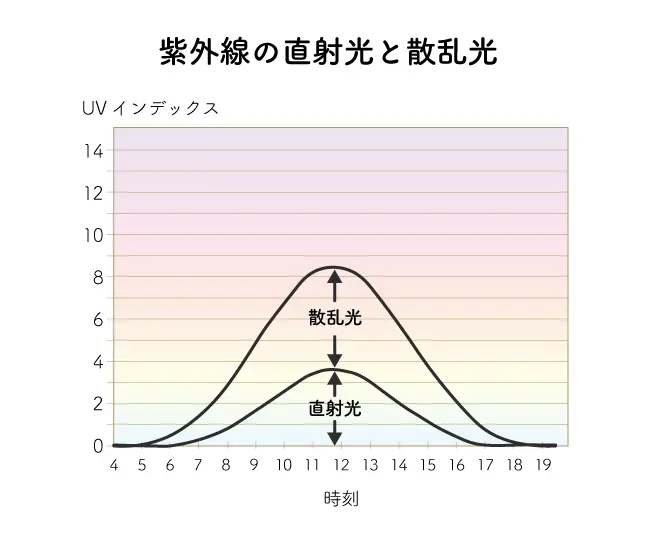 紫外線は太陽光から直接届くのみではありません。紫外線は反射するため、地面から反射したものや、チリやホコリによって散乱したものも届きます。それもかなりの量が反射によって届いています。