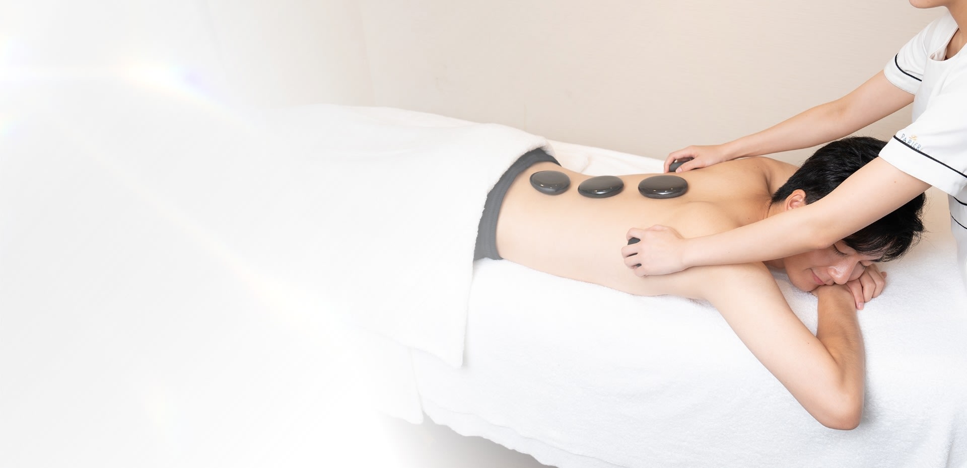 玄武岩を使用したホットストーンを遠赤外線効果により、こわばった筋肉をほぐし、腱やひざなどの動きや関節箇所をしなやかに。
