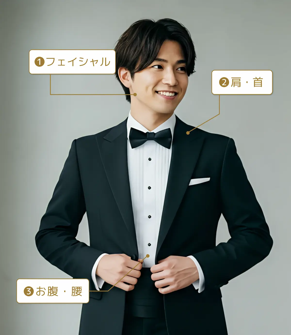 タキシードを着こなすための部分集中ケアで首肩周りをスッキリ姿勢よく見せ、自信を持って当日に臨めます。