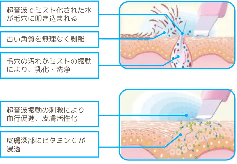 28kHz(1秒間に28,000回)の超音波振動が毛穴をふさぐ古い角質を取り除くと同時に、毛穴に詰まった奥の皮脂や汚れを瞬時に吹き飛ばします。
