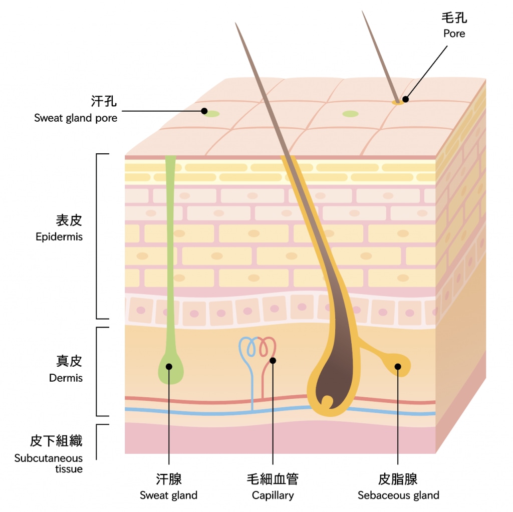 皮膚は大きく3つの層に分かれ、表面に近い方が「表皮」、肌の奥の方が「真皮」、更にその奥を「皮下組織」と言います。