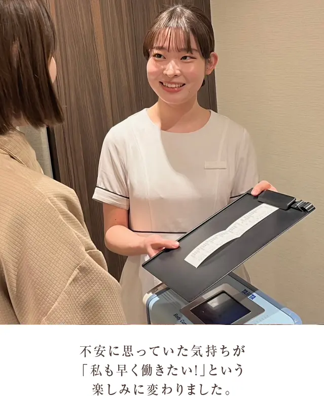 内定者の時点で研修を少しずつ始めることができたことが、今振り返っても自分にとって良い経験だったと思っています。インターンでは店舗に立って自分のできる仕事をしながら、エステティシャンとして働く先輩方の姿を間近で見ることができました。社会人として働くイメージを掴むことができ、不安に思っていた気持ちが「私も早く働きたい!」という楽しみに変わりました。 また、合宿研修では、社会人としての常識やマナーを基礎から教わることができ、とても貴重な経験となっています。慣れないことも多く大変でしたが、自分一人ではなく同期と協力しながら行動し、助け合うことで乗り越えることができました。研修を通して同期との絆も深まり、今でもお互いによき仲間として高め合いながら働いています。