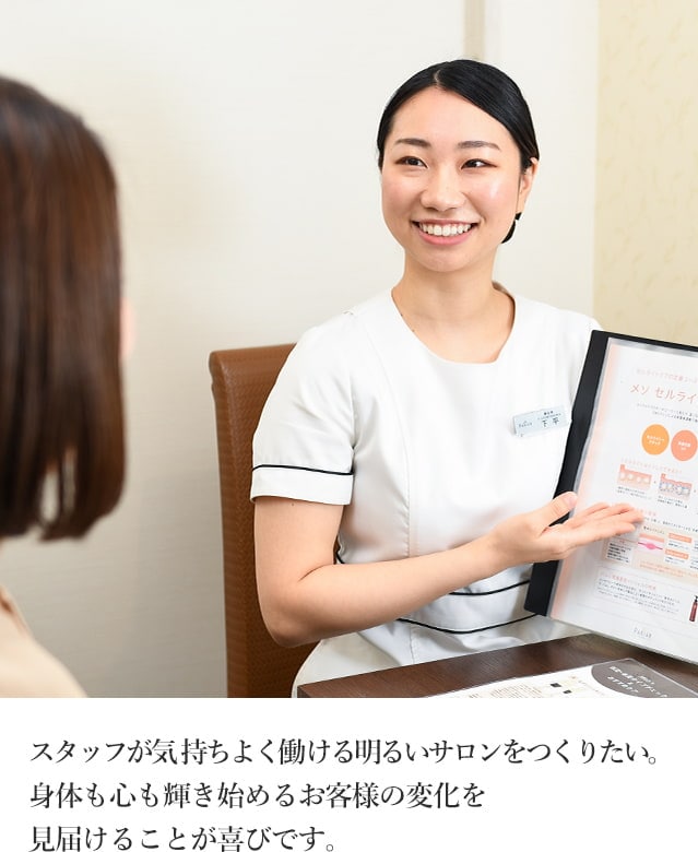 働く中で、上手くいかず自信が無くなることもありましたが、そんな自分に自信をくれるのはいつだってお客様の存在でした。どのような立場になっても、お客様に指名をいただいたり、自分の施術で結果が出たお姿を見ることが仕事を頑張れる原動力の一つになっています。