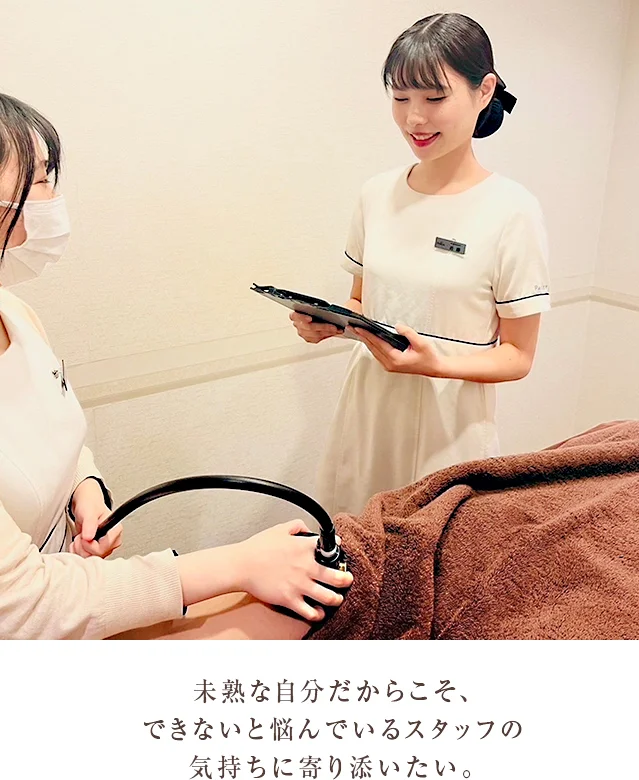 これまで後輩の悩みを聞く中で自分が大切にしていた考えが、副店長という役職になった今、より一層大事な考えであったと実感しております。私がこの考え方を出来るようになったのは、これまでお世話になった役職の方、店舗のスタッフの存在が大きいです。入社したばかりの事は、漠然と「役職につけたらいいな」という目標がありました。一緒に働いていた店長方はお客様の事やスタッフの事も考えていて、自分自身も学び続けているような憧れの存在で今もその気持ちは変わらずあります。 しかしエステティシャンとして日々働いていくうちに、「自分は店長たちみたいに周りを引っぱっていける存在に本当になれるかな、自分にはまだまだ足りないことがあるんじゃないかな」と、できる事が増えれば増えるほどそのポジションの大きさに自信をなくすことがありました。
