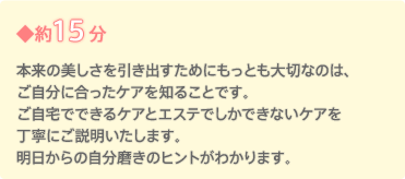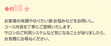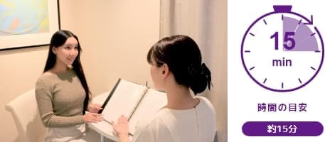 「初めてのエステで、流れがよくわからない」という方の不安や疑問を解消していただくために、体験コースの流れと所要時間の目安をご案内します。