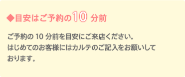 ご予約の10分前を目安にご来店ください。