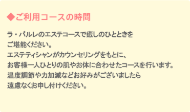 - ご提示したサービスの金額、内容、またその他気になることがありましたら、仮にお客様が「わがまま」「非常識」かもしれないとお感じになられた内容であっても、是非エステティシャンにご相談ください。ラ・パルレでは、お客様のどのようなご要望であっても、可能な限り全身全霊でその実現に向けてご対応させていただきます。
