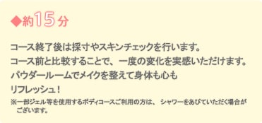 - [ボディコース]自分ではケアできなかった気になる部分を中心に、エステティシャンのプロフェッショナルな技術がしっかりアプローチいたします。